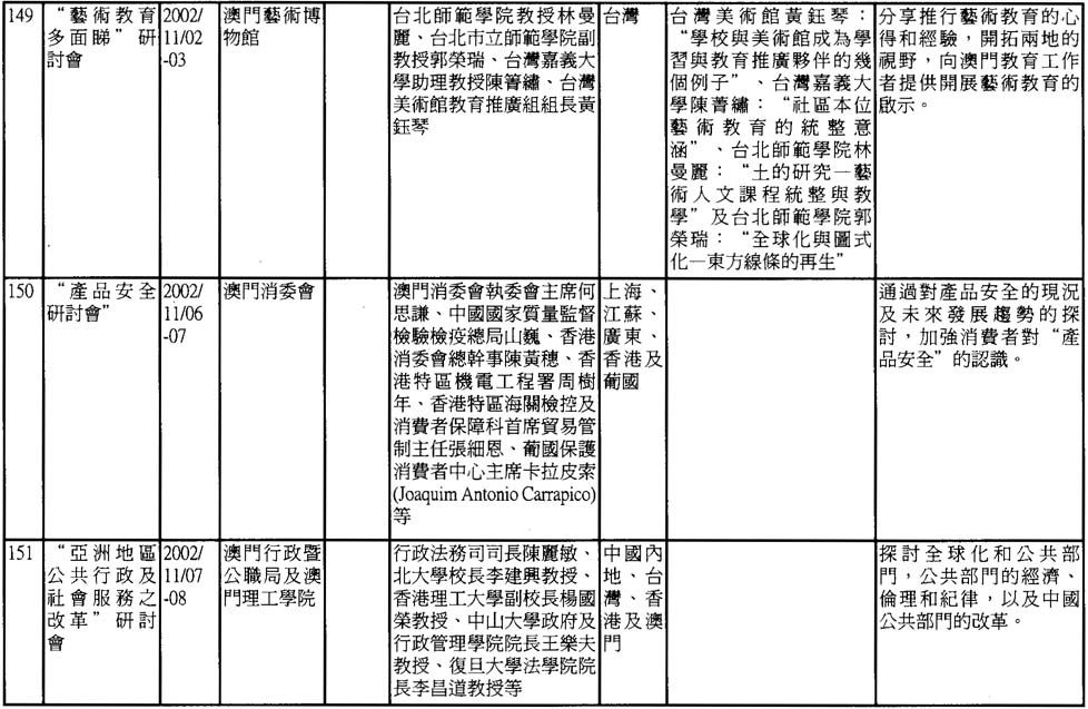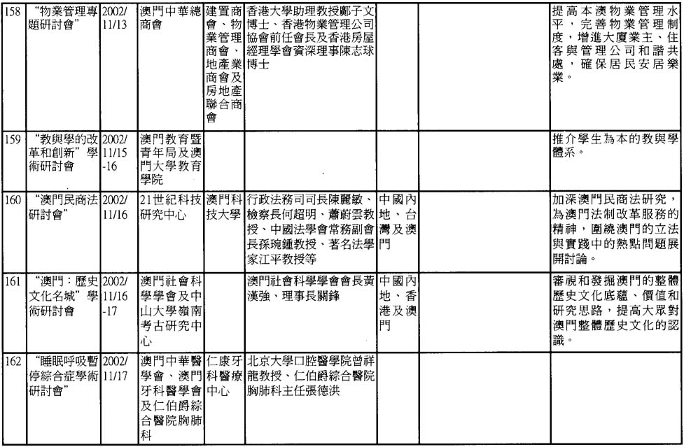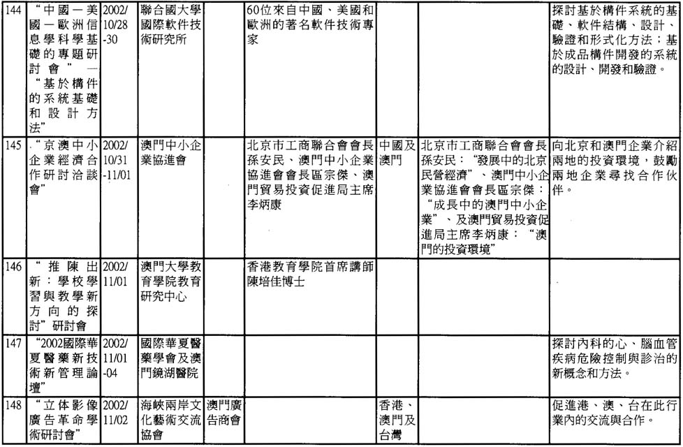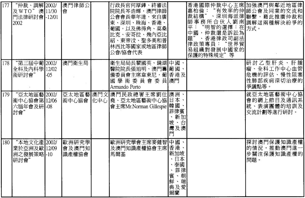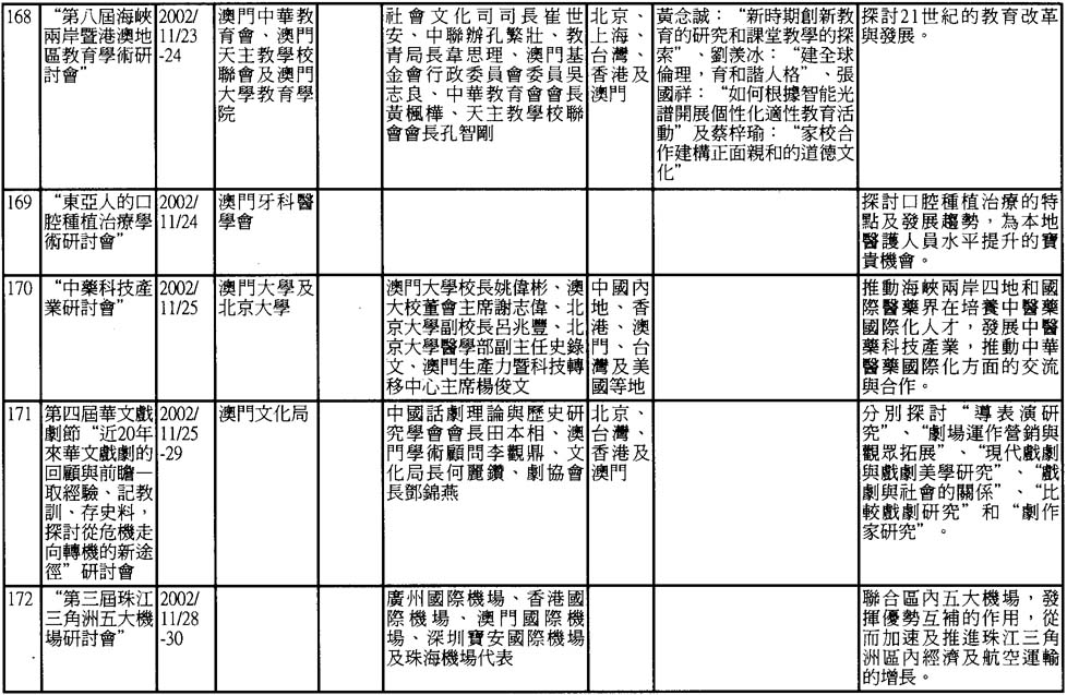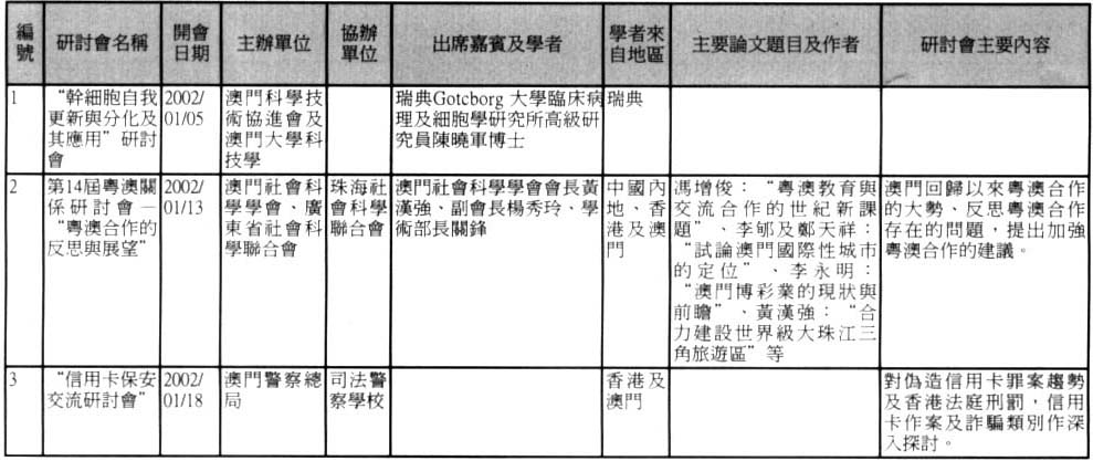 澳門是一個傳統的中外文化學術交流中心。雖然面對着經濟不景氣、資源不足等條件的制約,但澳門的學術活動仍然呈現出一派欣欣向榮的景象。根據非正式的統計,2002年澳門共舉辦了近190次不同類型研討會,現輯錄如下,謹供有關人士參考。