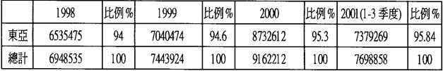 ┌─────┬────┬──────────┬──────────┐ │ 項目 │ │1992-1997增長率(%) │1997-2001增長率(%) │ │ 地區 │ │ │ │ ├─────┼────┼──────────┼──────────┤ │珠江三角洲│ GDP │ 13.5 │ 3.8 │ │ ├────┼──────────┼──────────┤ │ │ 出口 │ 11.9 │ 7.1 │ │ ├────┼──────────┼──────────┤ │ │ 儲蓄 │ 14.3 │ 7.2 │ │ ├────┼──────────┼──────────┤ │ │ 人口 │ 1.4 │ 2.0 │ ├─────┼────┼──────────┼──────────┤ │長江三角洲│ GDP │ 16.1 │ 9.7 │ │ ├────┼──────────┼──────────┤ │ │ 出口 │ 20.6 │ 18.4 │ │ ├────┼──────────┼──────────┤ │ │ 儲蓄 │ 26.6 │ 11.3 │ │ ├────┼──────────┼──────────┤ │ │ 人口 │ 0.9 │ 1.0 │ └─────┴────┴──────────┴──────────┘ |