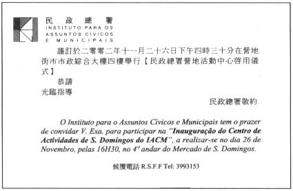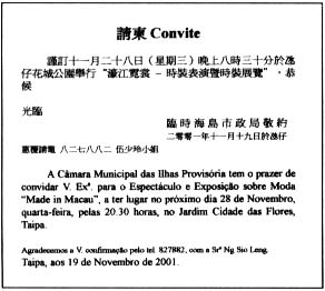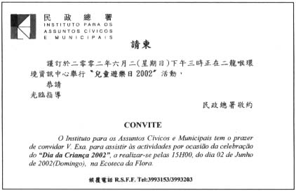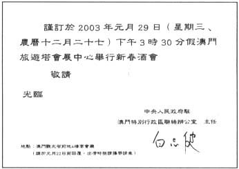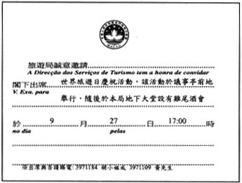 以上各種異化主要是行款形式的異化。作為文種的基本要素“啟始語、日期、時間、地點、事由、邀請語、署名、附啟語”等並沒有變化。此外,還有一種沒有署名的“無署名式”請柬,如澳門社會文化司旅遊局的請柬,即為此例(附圖11)。此式源於葡文,比較隨意,就像“秘書傳話”似的,不夠鄭重,對收柬人似乎不夠禮貌,不宜採用。該請柬採用中葡逐行對照的排版方式,亦不符合美觀原則和經濟原則。