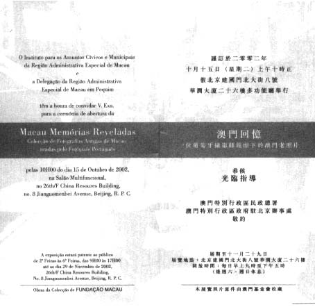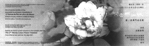 3、齊尾式。此式數量甚少,多出現在中葡雙語請柬中,葡文在左頁齊頭,中文在右頁齊尾,煞是美觀。澳門蓮藝文化協會等單位於2002年6月派發的“荷香樂滿城——第二屆澳門荷花節”請柬和澳門民政總署於同年11月發出的“路氹展新姿”請柬,均屬此例(附圖9)。如果能將請柬內中葡文的位置對調,就更能體現《澳門特別行政區基本法》第九條所說的“除使用中文外,還可使用葡文”的精神。