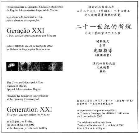 澳門民政總署於2002年6月發出的“二十一世紀的新銳——葡萄牙藝術家澳門五人展”請柬、澳門藝術博物館與故宮博物院等單位於同年12月發出的“懷抱古今——乾隆皇帝文化生活藝術展”請柬,即屬居中加齊頭式(附圖4)。