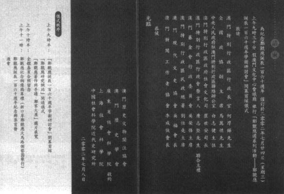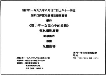 2、橫對摺式。這種形式在澳門使用得最廣泛。中央人民政府駐澳門特別行政區聯絡辦公室發出的新春酒會請柬,封面紅底國徽,內頁拴以絲索,在新口岸海景上以拷貝紙印上傳統規範的正文,顯得莊嚴隆重。澳門文化局與澳門中央圖書館於2000年12月舉辦的“翁方綱纂四庫提要稿”首次發行儀式的請柬也採用對摺式,正文用卷幅作襯底圖案,古雅大方,滿溢書香。由澳門歷史文物關注協會、廣東省社會科學院等單位聯合舉辦的“鄭觀應誕辰160週年學術研討會”的請柬,封面封底以澳門古地圖襯底,介紹鄭觀應週系列活動的內容;內頁則以直行排印,附啟安排儀式秩序,令整個請柬顯得內容豐富,引人入勝(附圖13)。