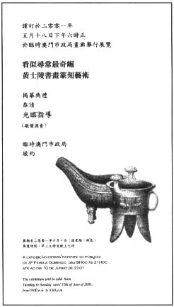 2、齊頭式。行款仿傚外文的技術處理,每行文字均在左邊齊頭,文面有整齊感,電腦操作也較方便。此式在澳門請柬中佔的比例僅次於居中式,名列第二。臨時澳門市政局於2001年5月發出的“看似尋常最奇崛——黃土陵書畫篆刻藝術”請柬和澳門綠化週組織委員會於2002年3月發出的“第廿一屆澳門綠化週”請柬,均為此式的範例(附圖6)。