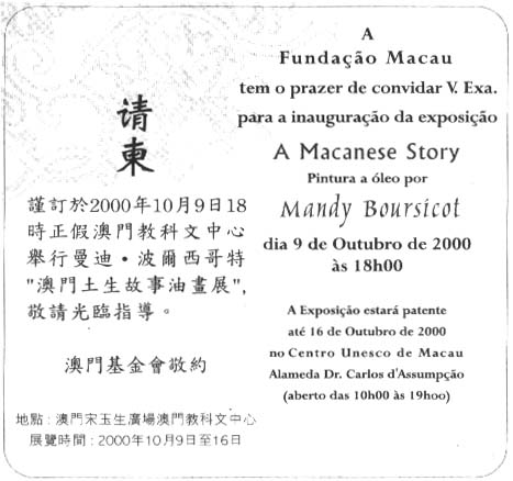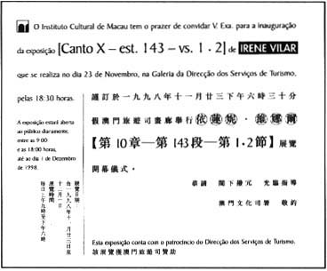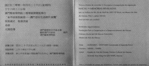 3、根據邀請不同嘉賓的實際需要,澳門的請柬有採用中葡雙文的,也有包括中葡文在內的三文甚至四文請柬。因中葡文是澳門官方語文,故中葡雙文的請柬甚多。其他三文、四文的請柬也不少。臨時澳門市政局與澳門發展與合作基金會製作的“開放融合——澳門國際版畫展”請柬為中葡英三語請柬,澳門藝術博物館與法國駐香港總領事館等單位聯合舉辦的“巨匠心影——畢加索版畫展”請柬為中法英葡四語請柬,澳門藝術博物館與意大利駐香港總領事館等單位聯合舉辦的“世紀回眸——意大利神父南懷謙清末民初中國寫真”攝影展覽的請柬則為中意英葡四語請柬。這種異化正好表明了澳門對外文化交流的重要地位。
