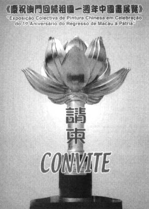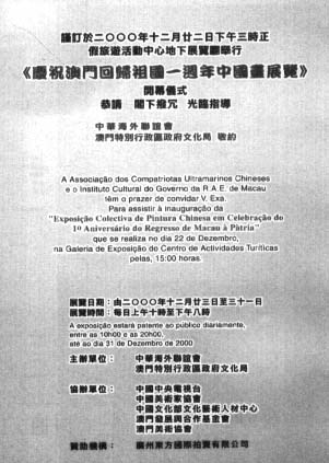 1、單張式。一面作封面,寫上“請柬”二字及活動內容;另一面則寫上請柬正文的內容。由中華海外聯誼會、文化局主辦,澳門發展與合作基金會、中國中央電視台等單位協辦的“慶祝澳門回歸祖國一週年中國畫展覽”的請柬便採用了這種形式(附圖12)。