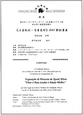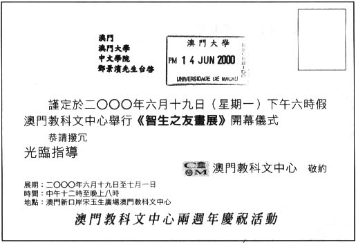 一是正文、署名均能齊頭,且能用稍大或稍粗字型突出“光臨指導”,或將“光臨指導”自列一行,以示尊重;而附啟語則用齊尾式。臨時澳門市政局於2001年11月發出的“鄭褧裳紀念畫展”請柬和澳門民政總署於2002年10月發出的“余國宏現代書畫展”請柬,均屬此例(附圖7)。
