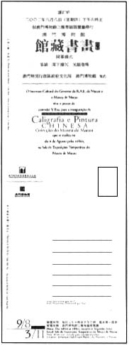 1、豎對摺式。由澳門文化局與澳門博物館於2002年8月聯合主辦的“澳門博物館館藏書畫特展”的請柬採用了豎對摺式,外頁印了館藏書畫各一,內頁上摺是請柬正文,下摺是明信片,大方典雅,賞心悅目(附圖15)。