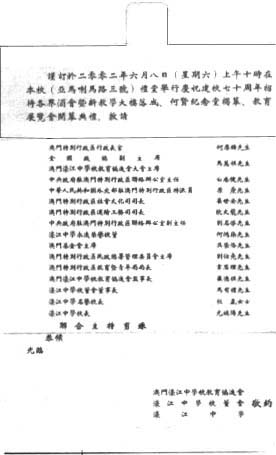 2、摺插式。這是在豎對摺式基礎上發展而來的、又摺又插的簡樸型請柬。它利用一種稍硬的咭紙,兩面印好後即可摺成橫長方形信封,將末端的魚尾插入背後的小縫,即可付郵。省錢省紙,頗受教育文化界歡迎。澳門濠江中學“慶祝建校七十週年酒會”的請柬,澳門業餘進修中心“慶祝建校二十週年酒會”的請柬,均屬這種形式(附圖16)。
