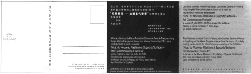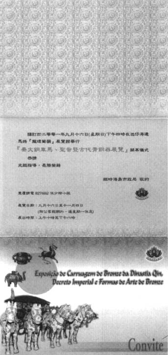3、三摺式。有豎三摺和橫三摺兩種形式。由澳門臨時海島市政廳於2001年9月舉辦的“秦大銅車馬、聖旨暨古代青銅器展覽”的請柬屬豎三摺式,臨時澳門市政局與法國駐香港總領事館、澳門法國文化協會聯合主辦的“尼斯新潮——法國當代藝術”展覽的請柬屬橫三摺式(附圖17)。