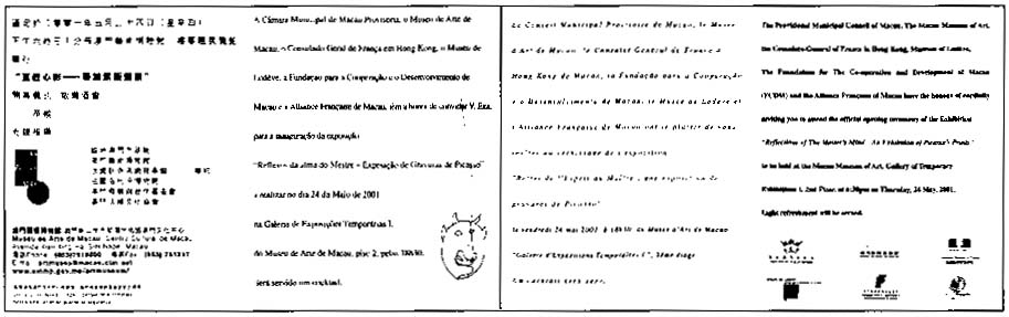4、四摺式。這種形式多數是橫四摺式。由澳門藝術博物館與北京故宮博物院等單位於2001年12月聯合舉辦的“海國波瀾——清代宮廷西洋傳教士畫師繪畫流派精品展”的請柬便採用了橫四摺式,兩面都印了精美華麗的西洋畫,頗為壯觀。澳門藝術博物館與法國駐香港總領事館等單位聯合舉辦的“巨匠心影——畢加索版畫展”請柬也屬橫四摺式(附圖18)。