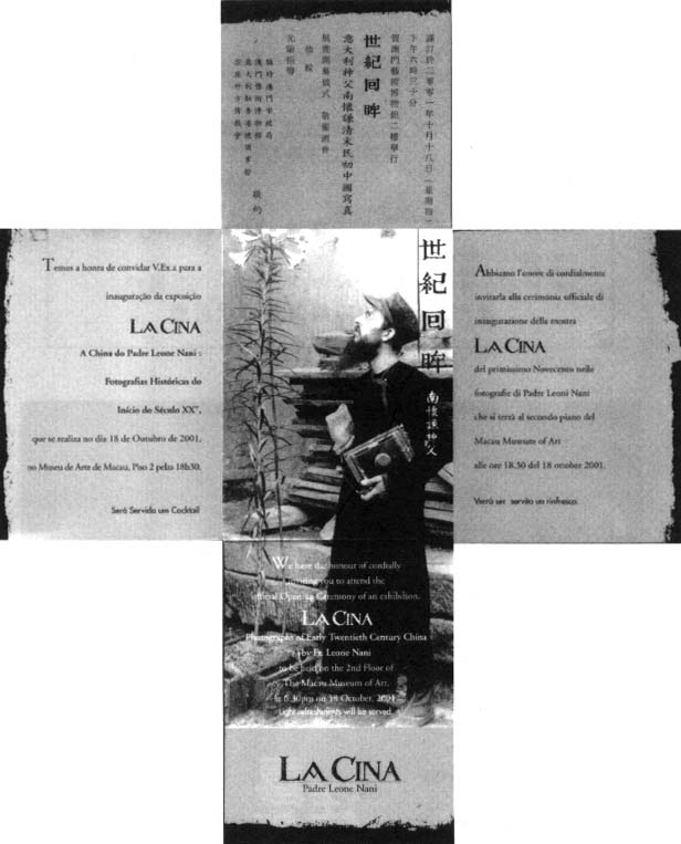 5、五摺式。由澳門藝術博物館與意大利駐香港總領事館等單位聯合舉辦的“世紀回眸——意大利神父南懷謙清末民初中國寫真”攝影展覽的請柬被裁成11公分寬的十字形,然後將四邊往內摺,造成一個正方形的五摺式請柬放在荷包型的套封裡,頗有懷舊情調。其十字形的請柬也象徵著神父胸前的十字架,宗教色彩十分濃厚,切合展覽內容,設計別具匠心(附圖19)。