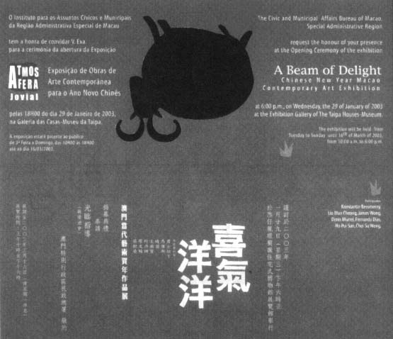7、賀年卡式。傳統的請柬版面多為方形平面,但澳門有些請柬則將其設計成賀年卡式樣:或以圖案襯底,或以圖案裝飾;而其圖案,或繪印,或剪裁;尤其是一些應節的請柬,更具有濃郁的節日色彩。澳門民政總署於今年春節前發出的、用中葡英三種文字印製的“澳門當代藝術賀年作品展”請柬,便將豎對摺式請柬的上頁中部剪空了一隻肥羊的圖案,特意露出下頁“喜氣洋洋”四字,以突出渲染羊年氣氛。設計頗有心思,效果亦較為理想(附圖21)。