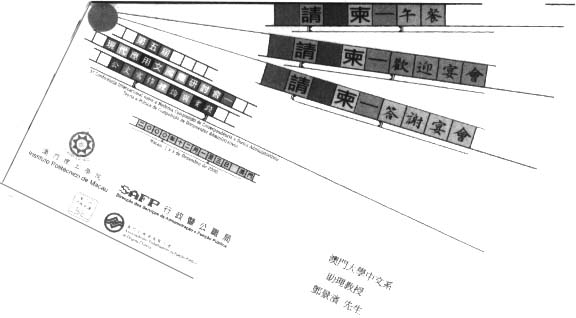 8、套餐式請柬。即在同一個會議中,針對不同的活動內容和不同的對象而製作一套多張不同內容的請柬。澳門理工學院於二OOO 年十二月舉辦第五屆現代應用文國際研討會所發的套餐式請柬,包括了開幕禮、歡迎宴會、午餐、答謝宴會等活動的請柬,風格統一,莊重美觀,頗獲好評(附圖22)。