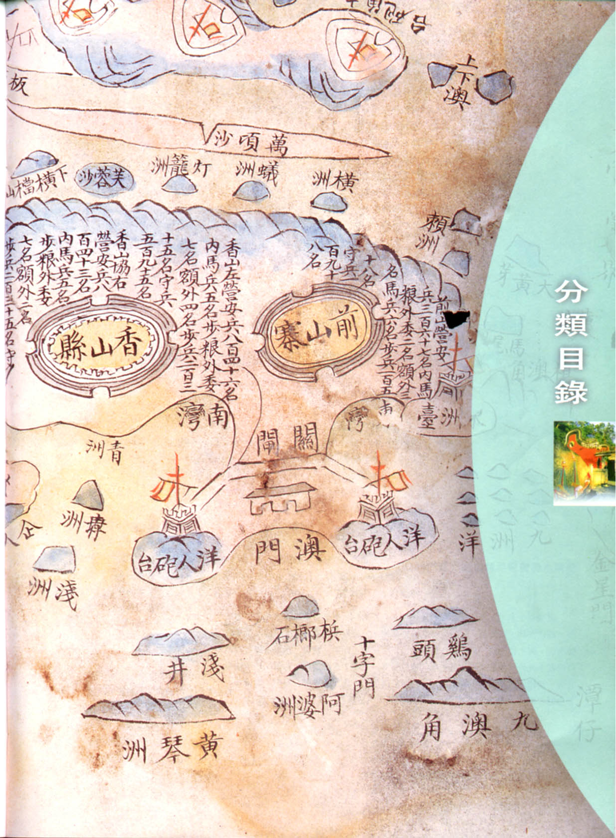 此圖以上為北,不考慮實際方位。自右向左展開。覆蓋面積東起懸鐘港、南澳鎮,西止江坪、東興街。該圖以傳統的形象畫法,展現了廣東境內海岸線及清軍駐防情況。圖上標有府、州、縣、村鎮、山川、島嶼、廟宇、營寨、汛所及炮台的地理位置。凡營寨繪有營盤,各營地間標注管界、里程、水深情況,各汛、司均繪有營房、旗幟,各州縣、營寨還記注有官兵駐防情形。澳門周圍繪有關閘、前山寨、香山縣、青洲、雞頭、九澳角、潭仔、九洲洋、金星門、淺洲與燈籠洲等。