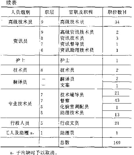 ─────┬───┬───────┬─────── 人员组别 │ 级别 │ 官职及职程 │ 职位数目 ─────┼───┼───────┼─────── 领导及主管│-- │司长 │ 1 │-- │副司长 │ 2 │-- │厅长 │ 5 │-- │处长 │ 11 │-- │科长 │ 3 ─────┴───┴───────┴─────── |