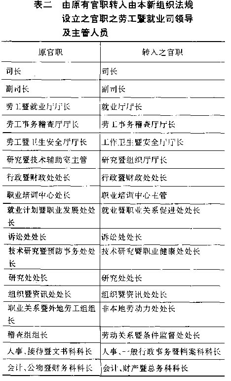 二、本法规附表二所载之劳工暨就业司之领导及主管人员,转入该表所指之相应官职,而该表为本法规之组成部分。