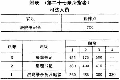 司法人员各官职或职级及职阶之薪俸,在附于本法规之薪俸表内订定。