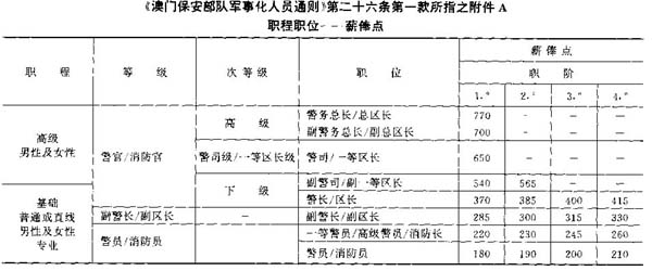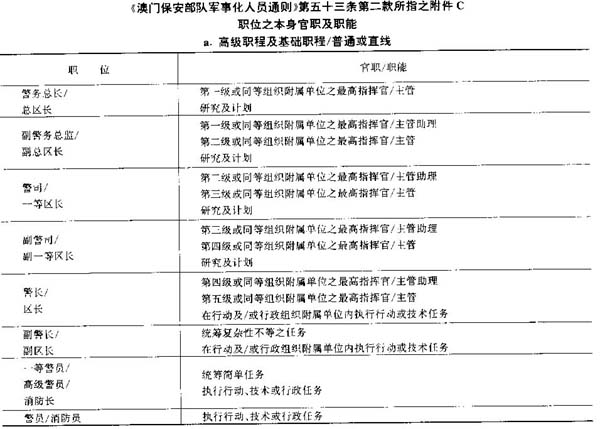 一、属六月二十九日第 56/85/ M号法令设立之水警稽查队、治安警察厅及消防队职程、且在九月五日第 84/88/M号法令第二条第二款规定所指具有下列职位之军事化人员,以下列对应方式,依法享有本通则规定之高级职程职位应有之敬礼及荣誉权利:
