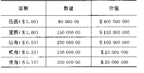 ———————————————————————————————————————————— 含量 合金 标准 重量 面额 名称 组成元素 % 形状 边 直径 厚度 标准 公差 公差 mm mm gr. ———————————————————————————————————————————— $5.00 白铜 Cu-Ni 75-25±1.0% 十二边形 平滑 28.0 2.20 10 ±1.5% (铜-镍) $1.00 白铜 Cu-Ni 75-25±1.0% 圆形 锯齿 26.0 2.20 9.0 ±1.5% (铜-镍) $0.50 洋银 Cu-Zn-Ni 65-34-1±1.75% 圆形 平滑 23.0 1.60 4.6 ±1.5% (铜-锌-镍) ±1.5%±0.25% $0.20 洋银 Cu-Zn-Ni 65-34-1±1.75% 十二边形 平滑 20.0 1.30 2.7 ±1.5% (铜-锌-镍) ±1.5%±0.25% $0.10 洋银 Cu-Zn-Ni 63-34-1±1.75% 圆形 平滑 17.0 1.00 1.4 ±1.5% (铜-锌-镍) ±1.5%±0.25% ———————————————————————————————————————————— |