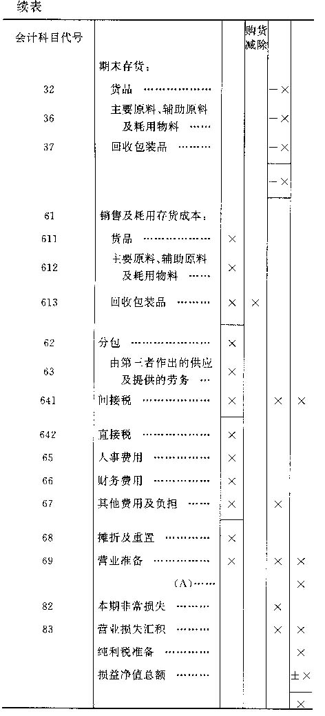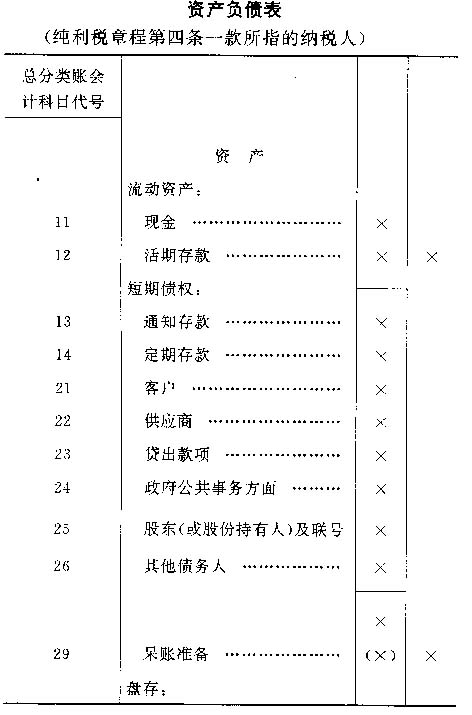 ────────────────┬────┬─────┬─────┬──── 账 户 │期初结账│设立或追交│拨回及取消│期末结账 ────────────────┼────┼─────┼─────┼──── 28 纯利税准备…………… │ │ │ │ 29 呆账及其他风险与负担准备……│ │ │ │ 39 存货减除准备………… │ │ │ │ 40 财务资产准备………… │ │ │ │ ────────────────┴────┴─────┴─────┴──── |