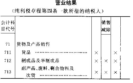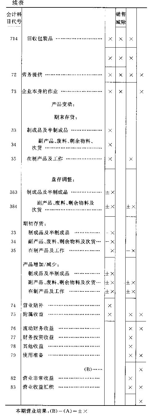 ──────────────────┬──────── 销售及耗用存货成本 │货物及产品销售 分包 │劳务提供 由第三者作出的供应及提供的劳务间接税│企业本身的作业 │产品变动 │营业贴补 │附属收益 ──────────────────┴──────── |
