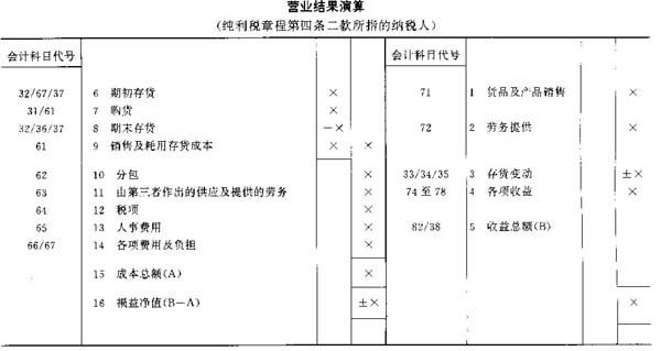 ──────────────┬──────────── 直接税 │ 本期财务收益 人事费用 │ 财务使用收益 财务费用 │ 其他收益 其他费用及负担 │ 准备金的使用 营业摊折及重置 │ 营业非常盈余 营业准备 │ 营业盈余汇积 营业非常损失 │ 汇积营业损失 │ 纯利税准备 │ 损益净值(十一) │ ──────────────┴──────────── |
