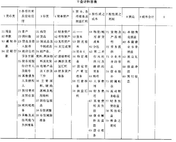 ──────────┬──────────────── 资产负债的会计科目 │ 1 货币类 │ 2 各项来往及预收预付 │ 3 存货 │ 4 资本资产 │ 5 资本、准备,及损益汇积 ──────────┼──────────────── 结果的会计科目 │ 6 按性质的成本 │ 7 按性质的收益 │ 8 结果 ──────────┼──────────────── 其他会计科目 │ 9 成本会计 │ 0 自定 ──────────┴──────────────── |