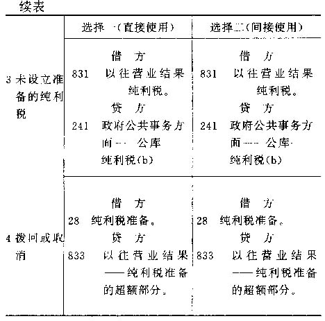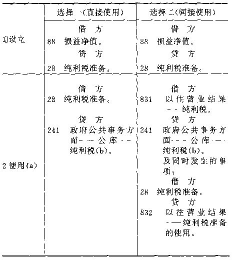 ────────────┬────────────── 事项 │ 会计科目 ────────────┼────────────── 设立 │88—损益净值 使用 │832—纯利税准备的使用 拨回或撤销 │833—纯利税准备的超出部分 ────────────┴────────────── |
