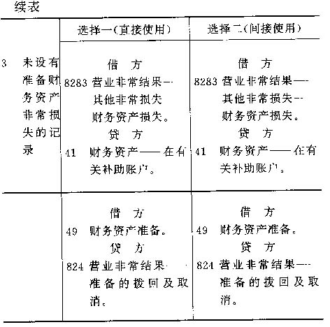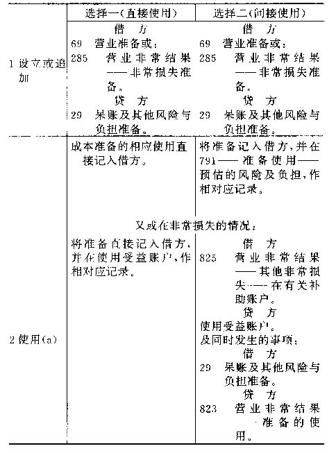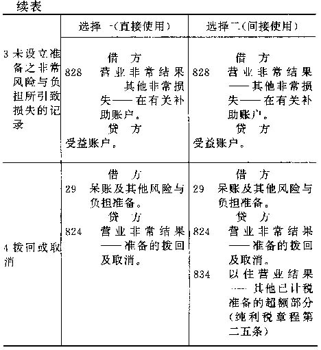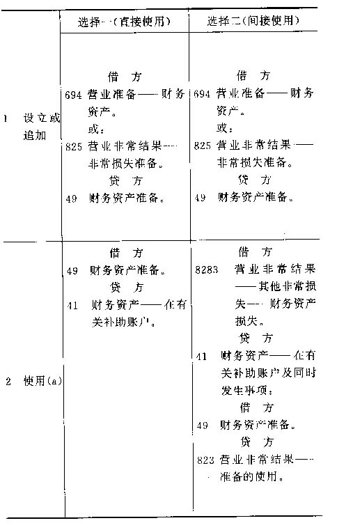 ────────────┬────────────── 事项 │ 会计科目 ────────────┼────────────── │69—营业准备 设立或追加 │825—非常损失准备 │79—准备的使用 间接使用 │823—准备的使用拨回或撤销 │824—准备的拨回及撤销 ────────────┴────────────── |