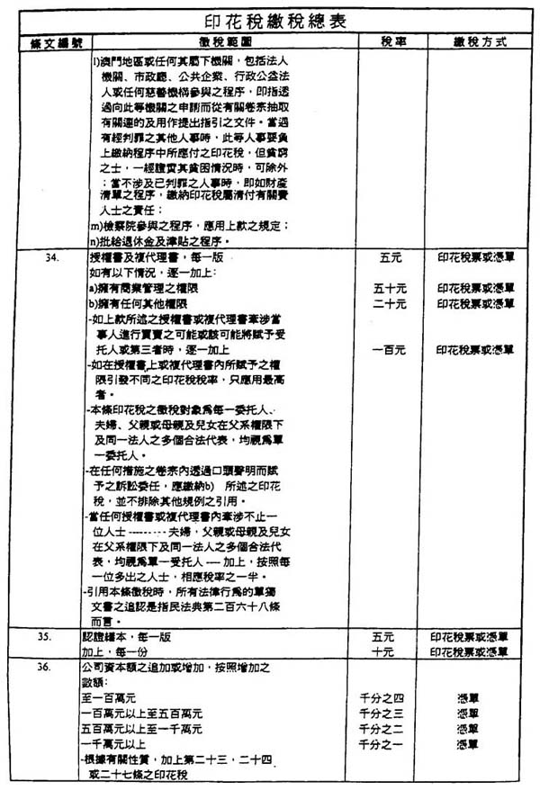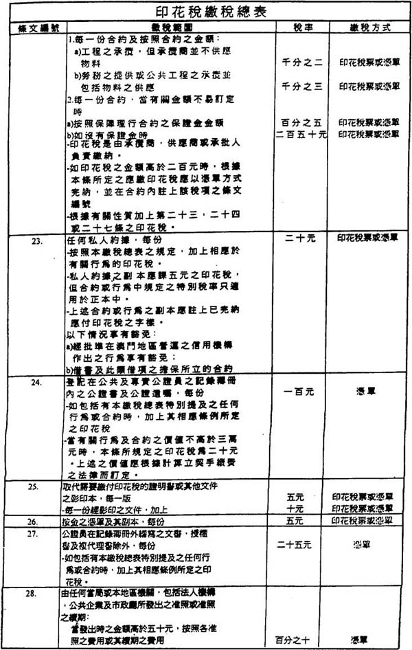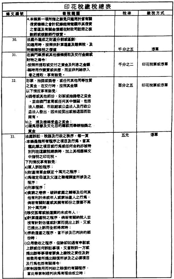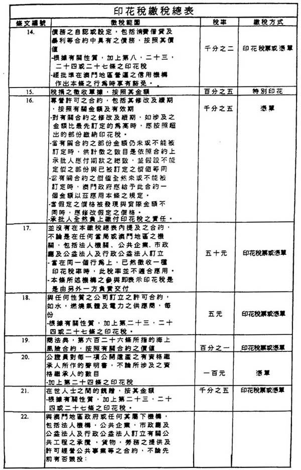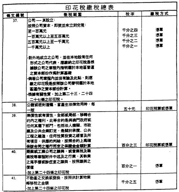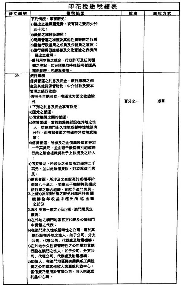 第三十八条 一、印花税“缴税总表”第二十九条之印花税是由信贷机构收取,在进行每一项营运时,从属于征税范围内之收益计算。