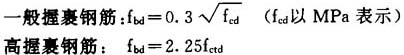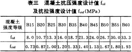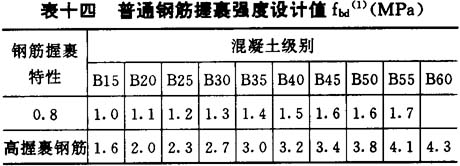 表六 各种混凝土等级之τRd值 ──────┬──┬──┬──┬──┬──┬──┬──┬──┬──┬─── 混凝土级别│B15 │B20 │B25 │B30 │B35 │B40 │B45 │B50 │B55 │B60 ──────┼──┼──┼──┼──┼──┼──┼──┼──┼──┼─── τRd │0.18│0.22│0.25│0.30│0.33│0.35│0.38│0.42│0.45│0.48 ──────┴──┴──┴──┴──┴──┴──┴──┴──┴──┴─── |