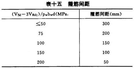 表七 τRd2应力值 ─────┬──┬──┬──┬──┬──┬──┬──┬──┬──┬─── 混凝土级别│B15 │B20 │B25 │B30 │B35 │B40 │B45 │B50 │B55 │B60 ─────┼──┼──┼──┼──┼──┼──┼──┼──┼──┼─── τRd2 │2.3 │3.0 │3.6 │4.2 │4.7 │5.2 │5.6 │6.O │6.6 │7.2 ─────┴──┴──┴──┴──┴──┴──┴──┴──┴──┴─── |