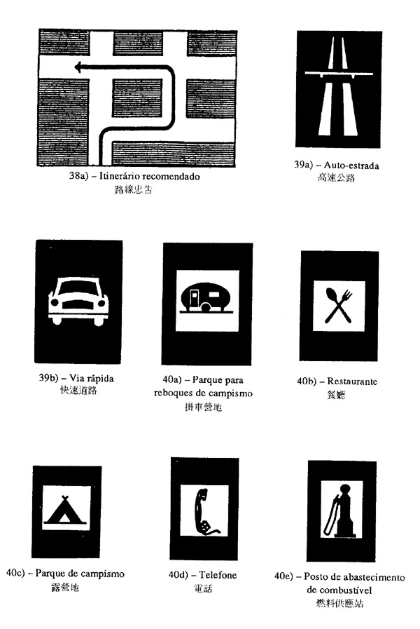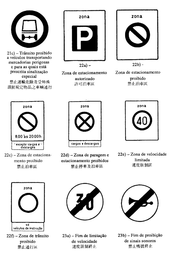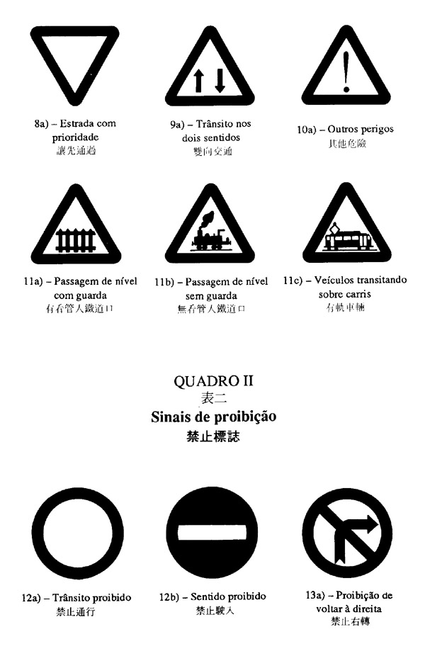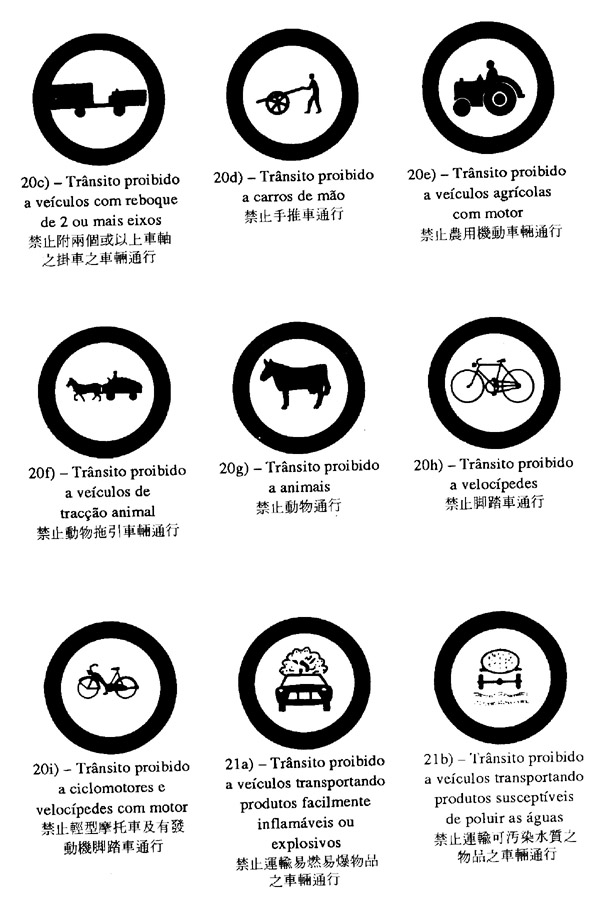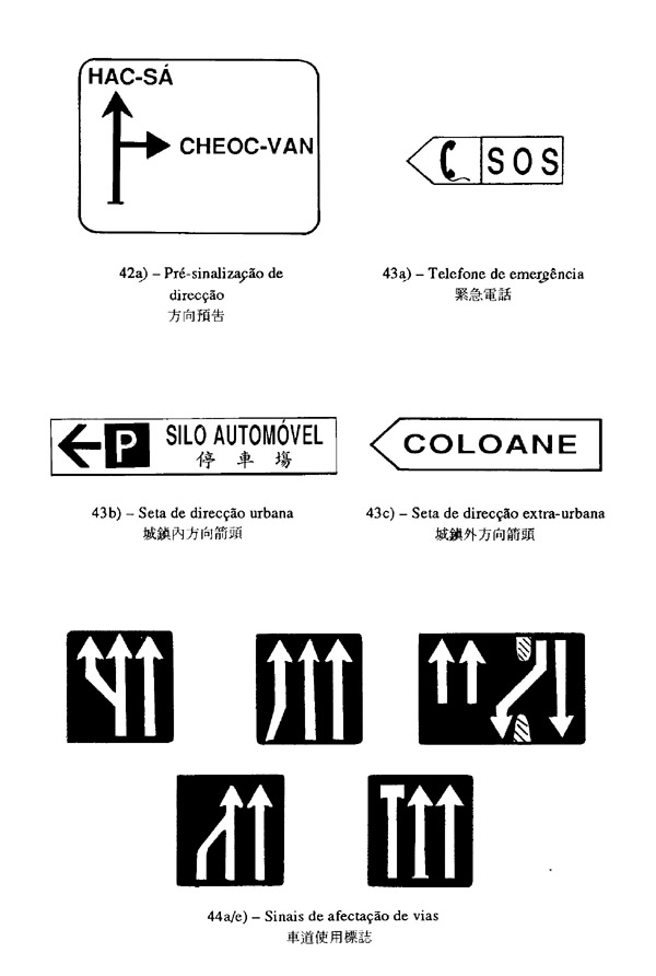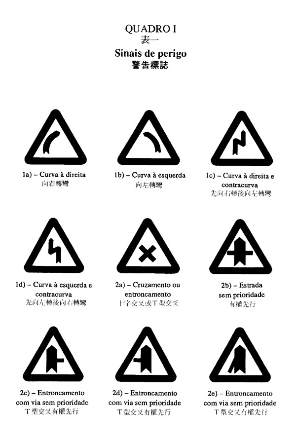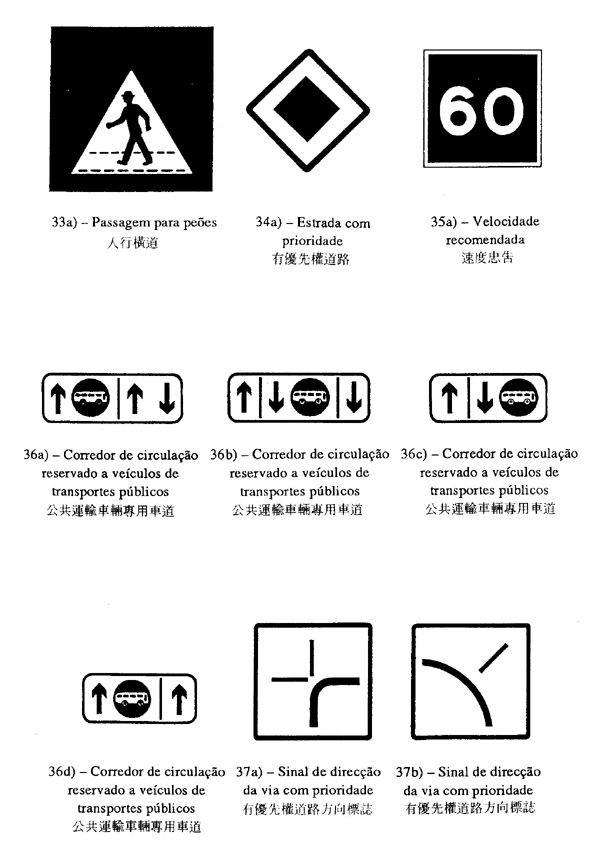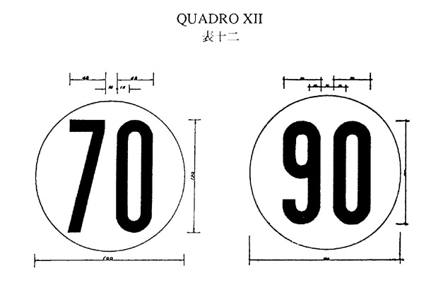 一、在公共道路之图形讯号及灯光讯号,应严格遵守以下各条及本规章附表所指形状及颜色之特征。此等特征应包括讯号中可能使用之文字及数字之字体。