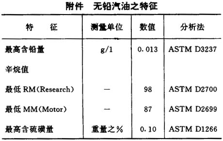 确定无铅汽油之特征并定出条件,规定自一九九五年一月一日起可使用无铅汽油之汽车方可进口及注册
