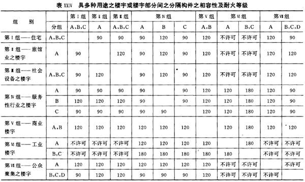 11)耐火等级(CRF):受标准试验之结构或分隔构件可保持其稳定、完整及绝缘特性之时间,即在时间后将出现构件塌陷或失去应有之性能,火焰或易燃气体窜入或因在未受波及之构件面过热起火。