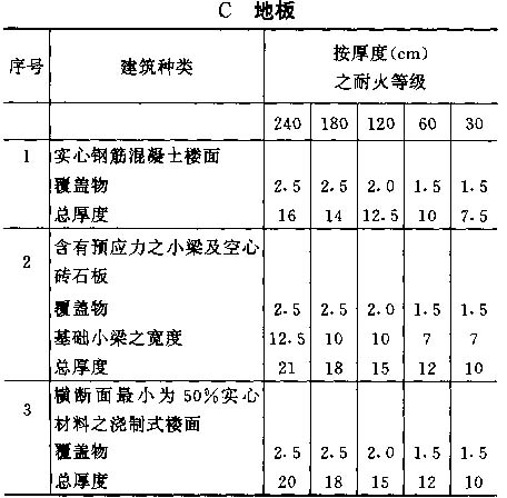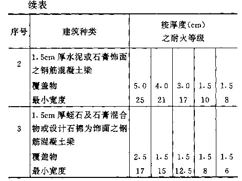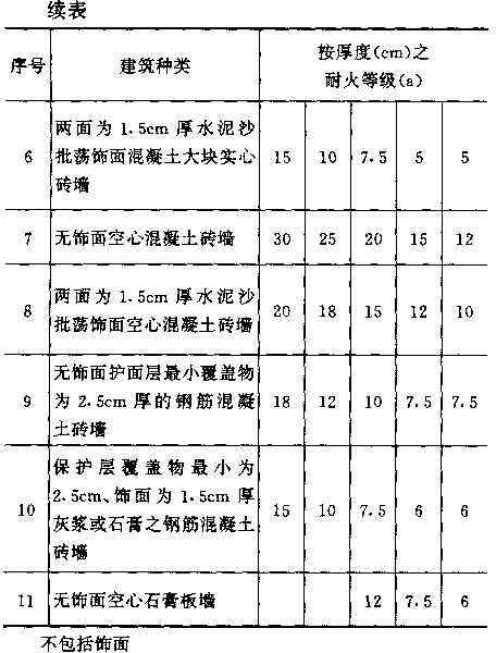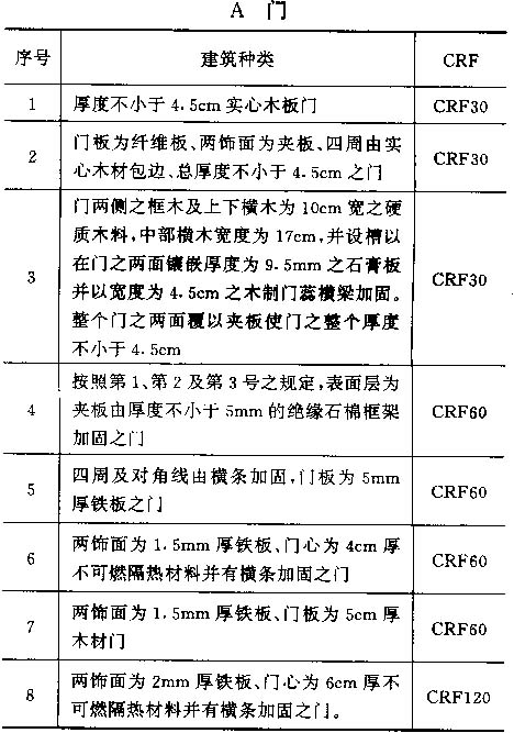 3.6 下面列举一些国家专业书籍推广之建筑构件之耐火等级( CRF)数据,但应注意只有经过实验室试验,才能确定建筑构件之耐火等级;所列之数据对所有构件之耐火性能之评定,只作为一般之指引。