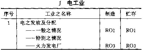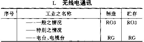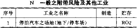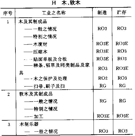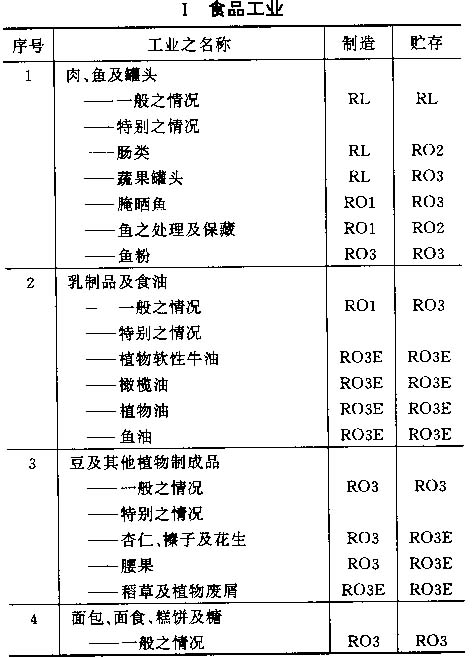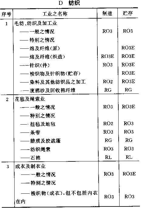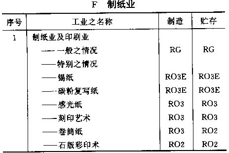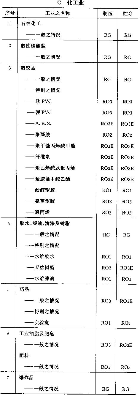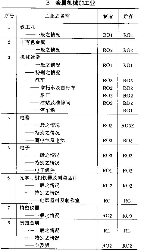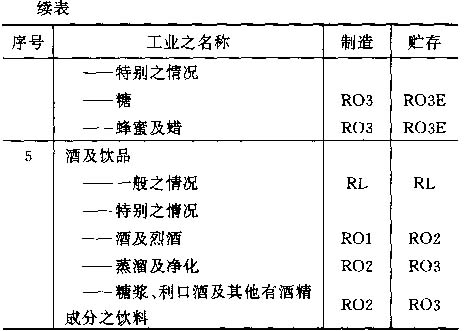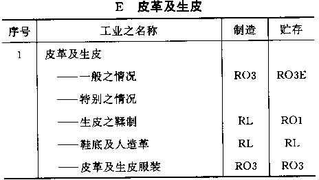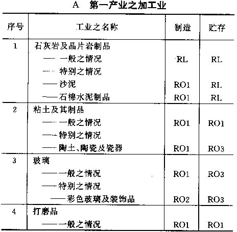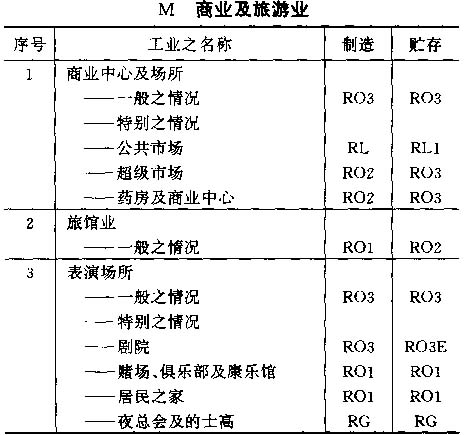 4.6 按以上标准对各工业之占用分类列于以下之各表内,并采用对每一风险程度之相应简称;按情况而定,该简称将注明在制造及贮存栏内。