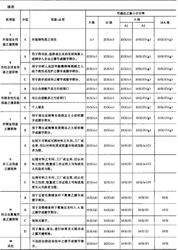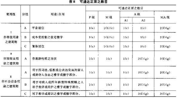 4.1 为本规章之效力,采用葡萄牙保险协会出版之“火险技术规定”内所载之“占用分类”表作为工作基础,且该表在大多数之情况下均符合本规章之目标,以及以 NFPA( N a t io n a l Fir e Pr o tec t io n A s so c ia t io n)及 AP- SAIRD( A s sem b lée Plen iè r e d e s So c ie tée s D'A s su r an ce s In cen d ie e t R isq u e s D iv e r s)之分类为基础,故将该表转载。