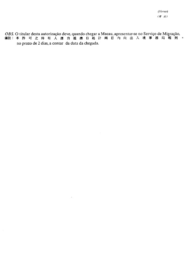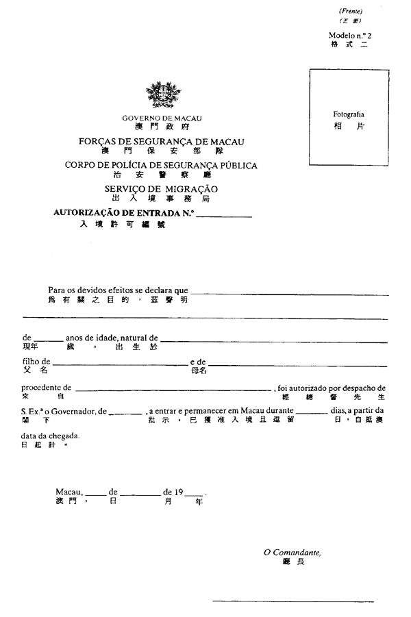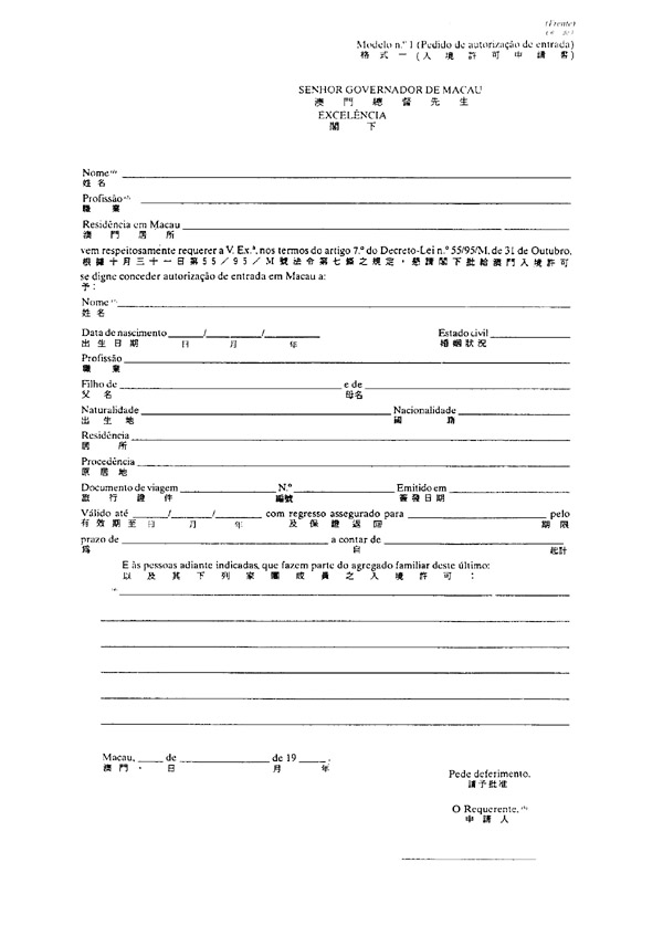 一、常居于无葡萄牙领事或外交代表处之国家或地区之人士之入境许可,应由利害关系人或法定代理人透过本法规所附格式一之文件,经治安警察厅(葡文缩写为PSP)出入境事务局,向总督申请。