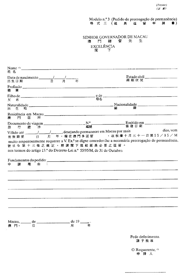 二、说明理由且透过附于本法规之格式三而呈交之申请书,应在已获批给之逗留许可之续期失效日之最少十日前,向治安警察厅出入境事务局递交。