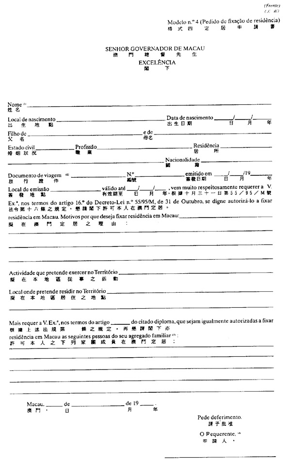 一、在澳门定居之申请应向总督提出,而有关申请应透过经利害关系人或其法定代理人签名之本法规所附格式四之文件,向治安警察厅出入境事务局递交。