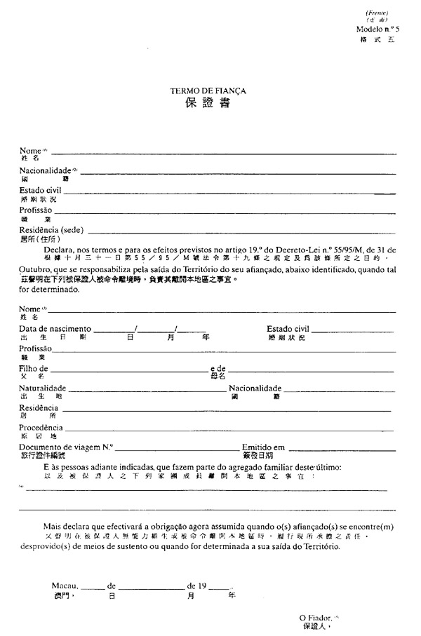 一、拟在本地区定居之人士,须设定一名居留于澳门之人士作为适当之保证人,而该保证人应透过本法规所附格式五之文件,保证负担其离开本地区所需之费用。