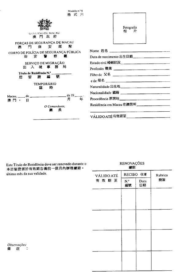 a.临时居留证,载于本法规所附格式六内,有效期为自签发日起计之一年,且得以相同期限续期;
