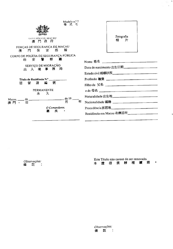b.永久居留证,载于本法规所附格式七内,签发予在澳门连续居住七年之人士。