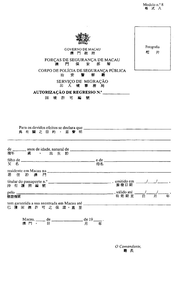 一、欲暂时离境前往其他国家或地区,而须向有关当局证实其获准回澳之居留于澳门之人士,得透过本法规所附格式八之文件,向治安警察厅出入境事务局申请回境许可。