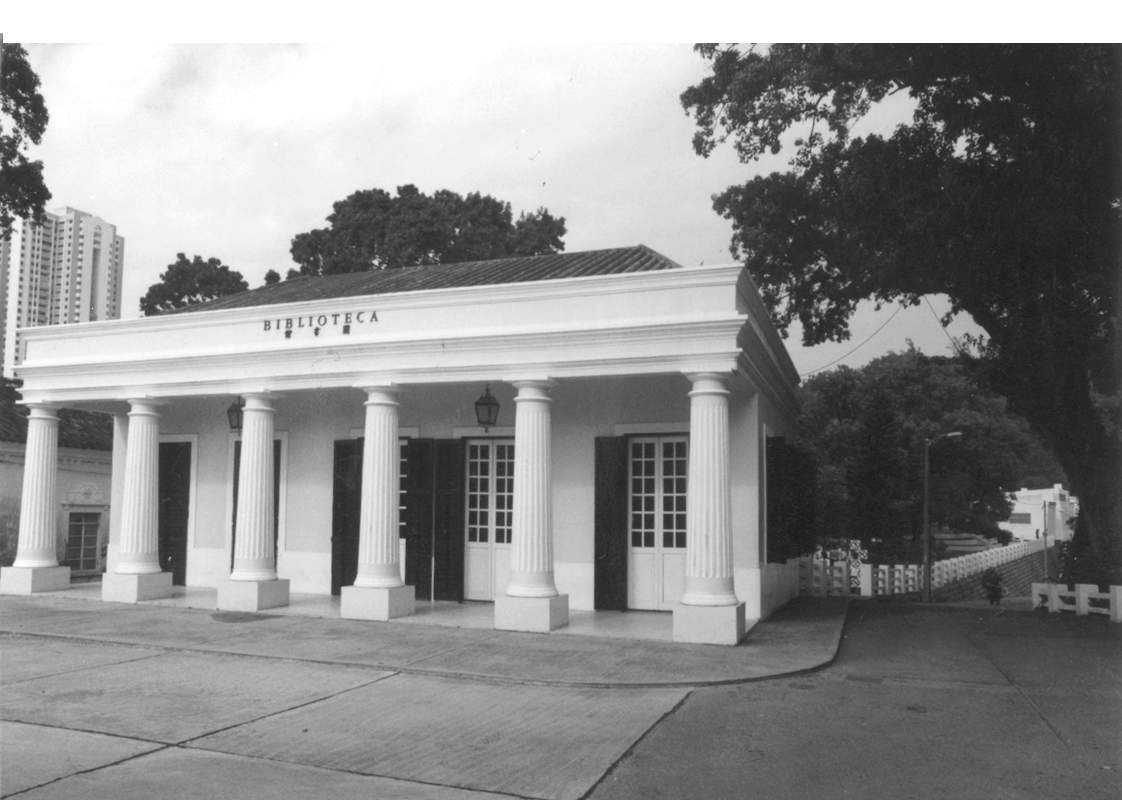 氹仔圖書館建築設計與路環圖書館很相似,仿如孿生姊妹,都建於一九一一年。無獨有偶,兩者而今都成爲圖書館。氹仔圖書館也是一座平房,門前走廊有六根圓柱,風格古樸,具南歐色彩,只是內裏佈局和外在環境與路環圖書館不同而已。