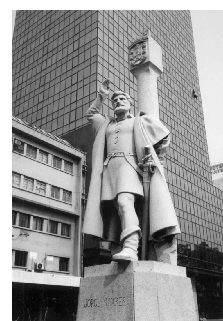 穿歐洲中古裝束,腰佩長劍,伸出右手,作指揮狀,背靠雲石園柱,神態軒昂,它是在澳葡人紀念其先輩歐維士於一九五四年九月十六日豎立。這座雕像是葡國雕塑家華斯創作,由葡運來澳安裝。