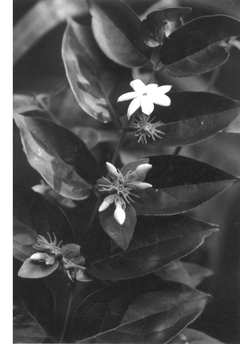 《澳門植物名錄》中都有“茉莉”條。茉莉是一種普通花木,栽種普及,夏季開花。色澤一般是雪白,嬌俏玲瓏,清香馥鬱,分單托、雙托及千層三種。品種很多,少見的有綠茉莉、黃茉莉、五色茉莉等,在本澳離島有野生紫茉莉及公園栽種的毛茉莉。