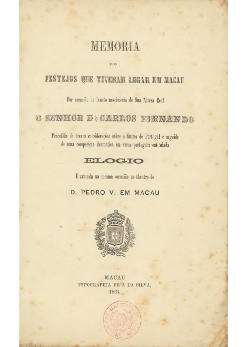 篩選: 排序 最新至最舊 最舊至最新 熱門 隨機探索 篩選 類型 圖書(3) 學科 社會科學(2) 文化/禮俗(1) 政治/行政(1) 顯示更多 歷史/地理(1) 歷史(1) 顯示更多 作者 Pereira, J. F. Marques(1) Pereira, António Marques(1) Sampaio, Manuel de Castro(1) 顯示更多 語言 葡文(3) 篩選 重設 AS ALFANDEGAS CHINESAS DE MACAU : ANALYSE DO PARECER DA JUNTA CONSULTIVA DO ULTRAMAR SOBRE ESTE OBJECTO Pereira, J. F. Marques EPHEMERIDES COMMEMORATIVAS DA HISTORIA DE MACAU E DAS RELAÇÕES DA CHINA COM OS POVOS CHRISTÃOS Pereira, António Marques MEMÓRIA DOS FESTEJOS QUE TIVERAM LOGAR EM MACAU POR OCASIÃO DO FAUSTO NASCIMENTO DE SUA ALTEZA REAL O SENHOR D. CARLOS FERNANDO PRECEDIDA DE BREVES CONSIDERAÇÕES SOBRE O FUTURO DE PORTUGAL E SEGUIDA DE UMA COMPOSIÇÃO DRAMÁTICA EM VERSO PORTUGUEZ ENTITULADA ELOGIO Sampaio, Manuel de Castro AS ALFANDEGAS CHINESAS DE MACAU : ANALYSE DO PARECER DA JUNTA CONSULTIVA DO ULTRAMAR SOBRE ESTE OBJECTO Pereira, J. F. Marques | Typographia de J. da Silva 澳門的中國海關:海外顧問委員會對此議題的意見分析 EPHEMERIDES COMMEMORATIVAS DA HISTORIA DE MACAU E DAS RELAÇÕES DA CHINA COM OS POVOS CHRISTÃOS Pereira, A. Marques | Typographia de J. da Silva 1868年,澳門土生葡人史學者、報人和政論家庇禮喇編著的《澳門歷史及中國與基督教人民關係大事記》於本年在澳門出版。該書內容曾發表於1867年的Boletim do governo da provincia de Macau e Timor(《澳門和帝汶省政府公報》)。 這是一部澳門編年史書,全書以月份為線索,編排有關歷史事件的史書體例撰寫而成,主要敘述葡萄牙人在澳門的政治事件,特別注重中華帝國對澳門城的控制,是早期的澳門研究中的重要文獻,也常為一些後來的葡裔作者的研究著作所引用,作為支持葡萄牙與中國簽署的條約之間的一些政治和法律問題的歷史資料來源。 MEMÓRIA DOS FESTEJOS QUE TIVERAM LOGAR EM MACAU POR OCASIÃO DO FAUSTO NASCIMENTO DE SUA ALTEZA REAL O SENHOR D. CARLOS FERNANDO PRECEDIDA DE BREVES CONSIDERAÇÕES SOBRE O FUTURO DE PORTUGAL E SEGUIDA DE UMA COMPOSIÇÃO DRAMÁTICA EM VERSO PORTUGUEZ ENTITULADA ELOGIO Sampaio, Manuel de Castro | Typographia de J. da Silva