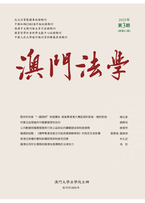 本刊是由澳門大學法學院主辦的綜合性法學學術期刊,創刊於2005年,每年三期,逢2月、6月和10月出版。該刊一貫秉承學術研究的嚴謹性和開放性,嚴格遵守學術規範,並以不斷推動澳門地區的法學理論發展,不斷推動海峽兩岸暨港澳地區的區際法律比較研究為辦刊宗旨。